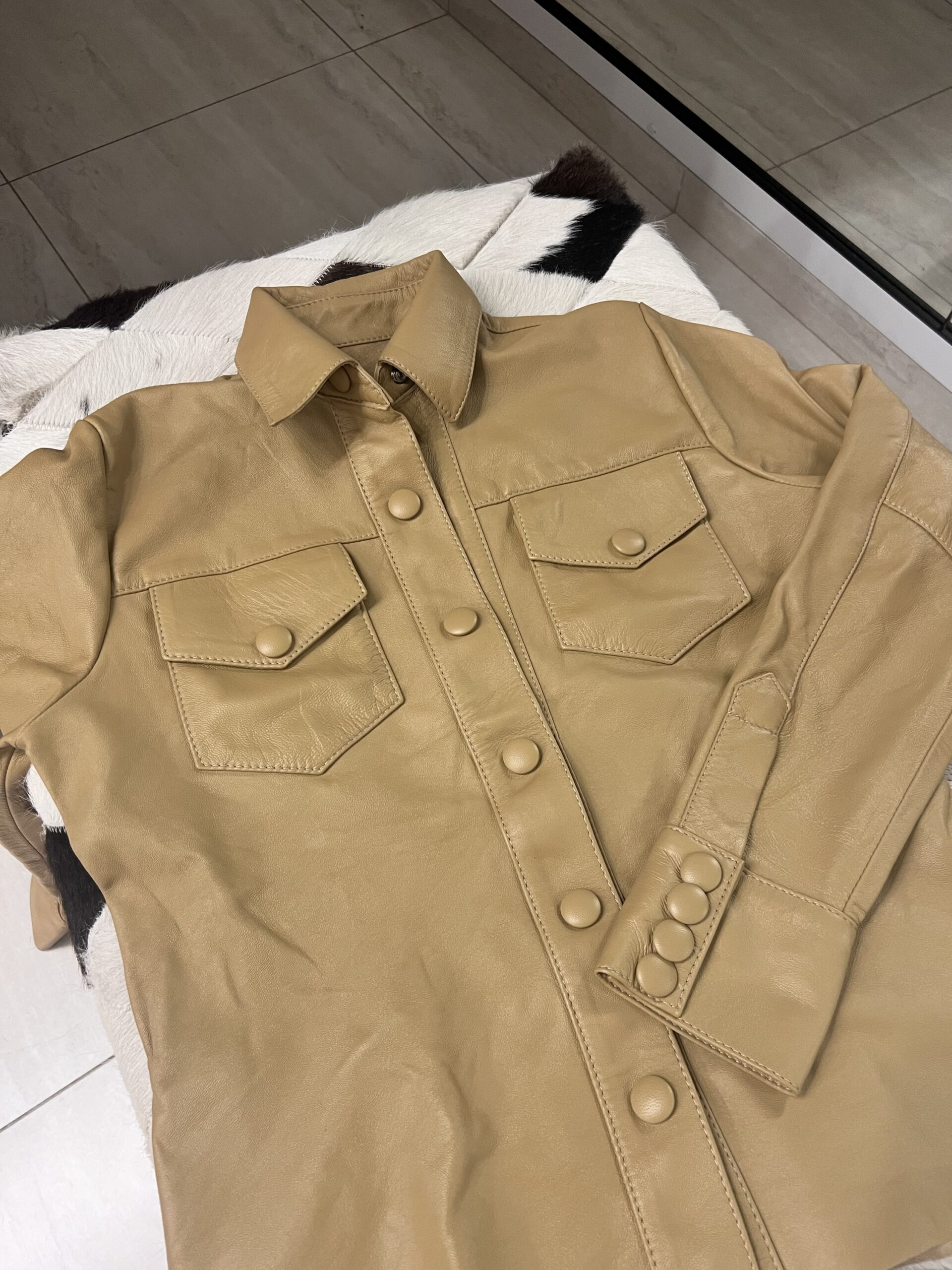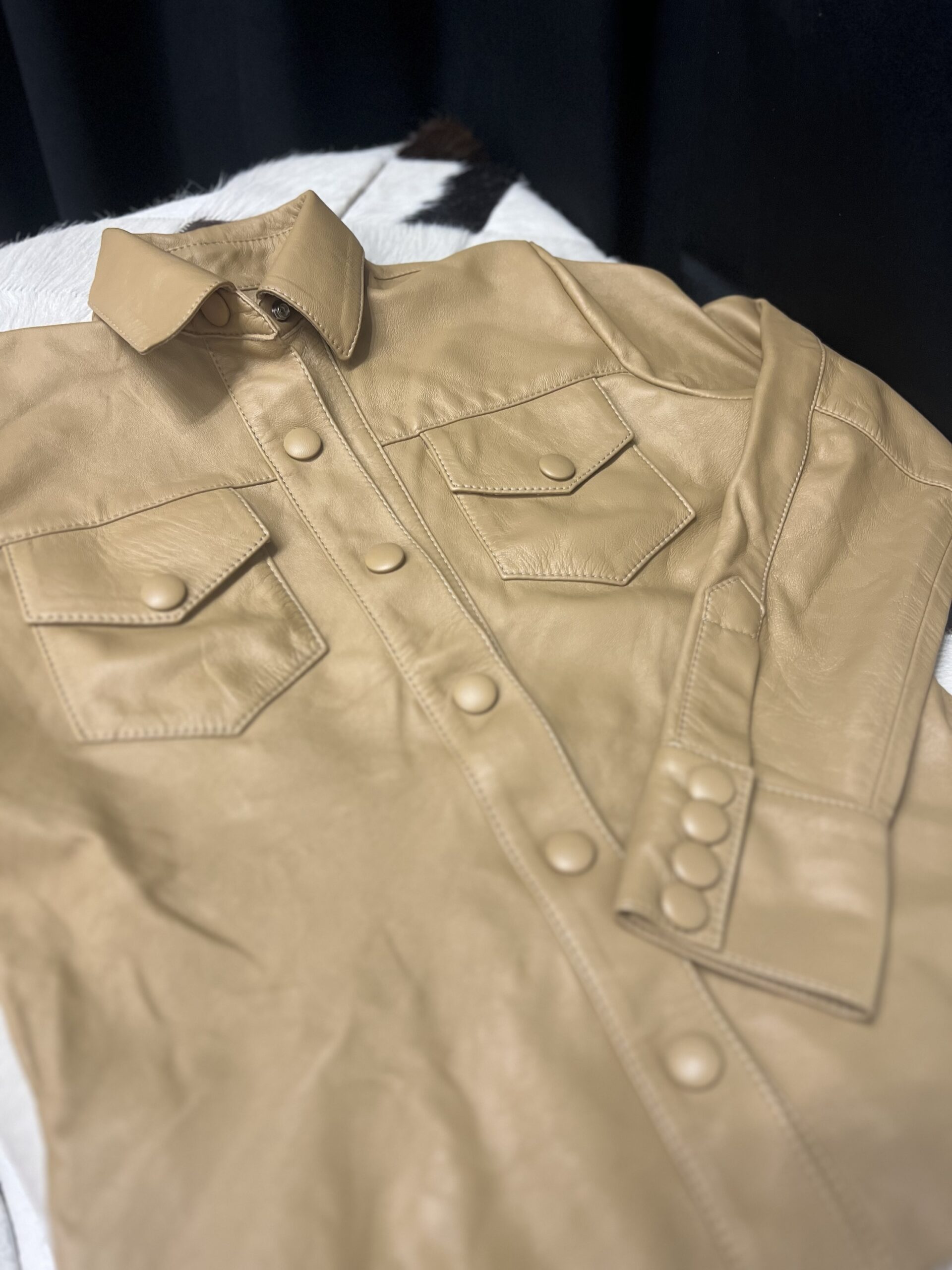 Camisa em couro legítimo, acinturada, clássica e elegante. Botões forrados em couro e detalhe dos punhos largos trazendo sofisticação à peça.
