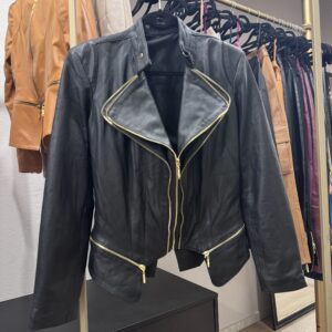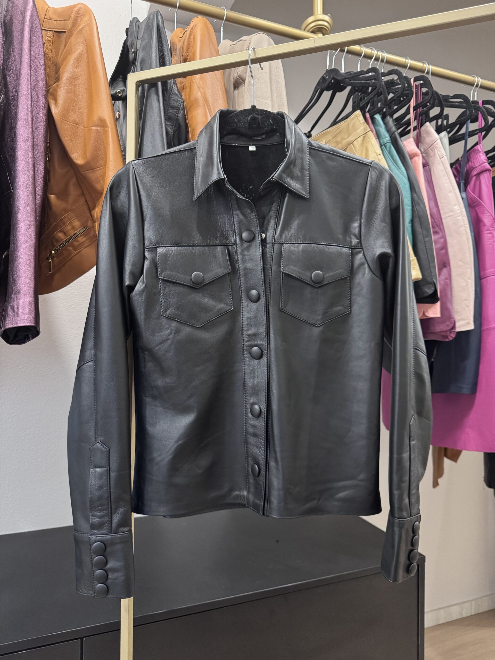 Camisa em couro pelica, detalhe em botões forrados, tamanho PP.