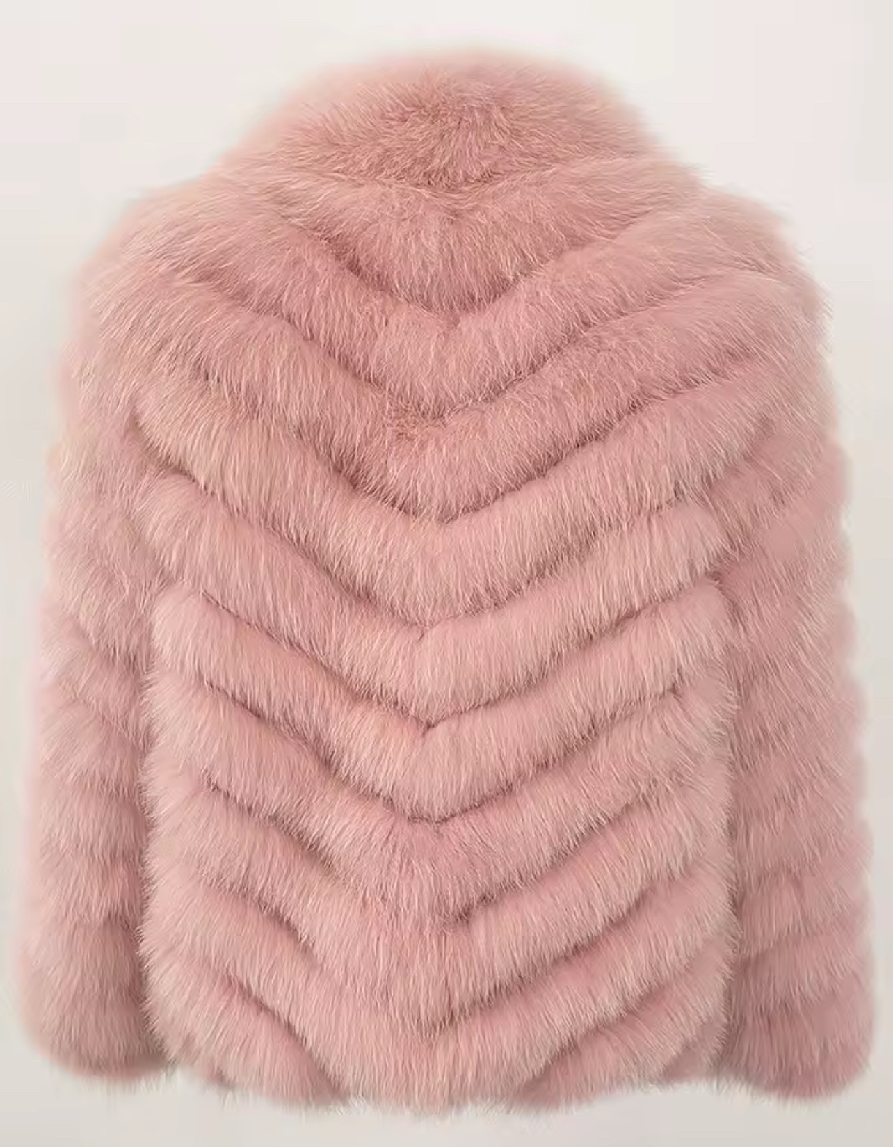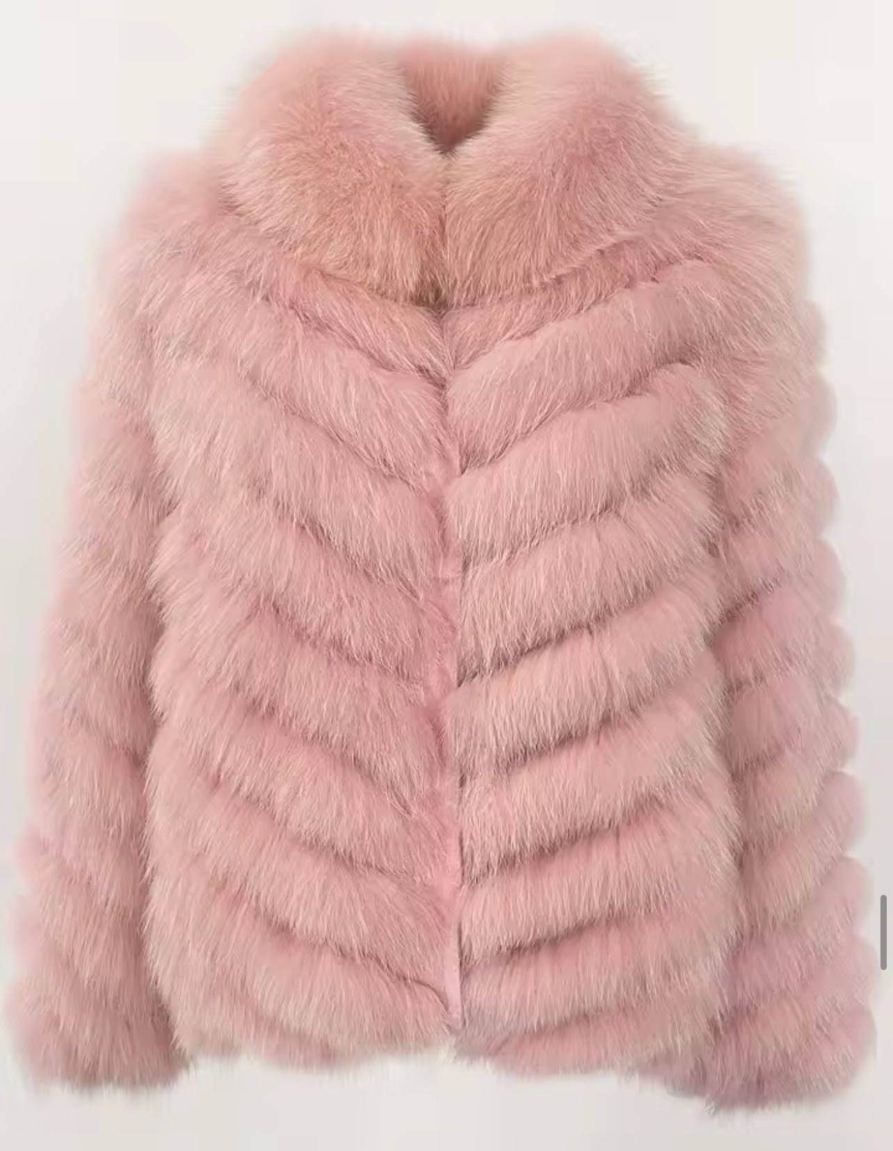 Casaco todo em pele natural de raposa, na cor rosa claro. Ele é reversível, tem a possibilidade de usar nos dois lados. O lado interno o tecido é cetim, na mesma cor da pele.