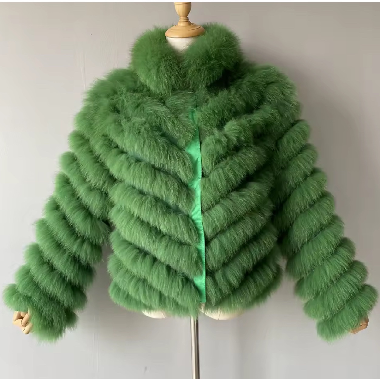 Casaco todo em pele natural de raposa, na cor verde bandeira. Ele é reversível, tem a possibilidade de usar nos dois lados. O lado interno o tecido é cetim, na mesma cor da pele.