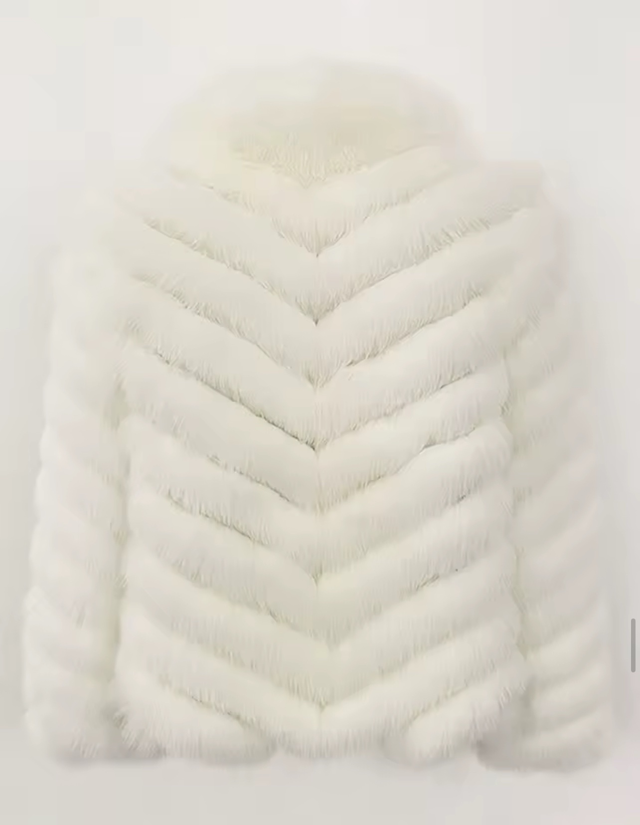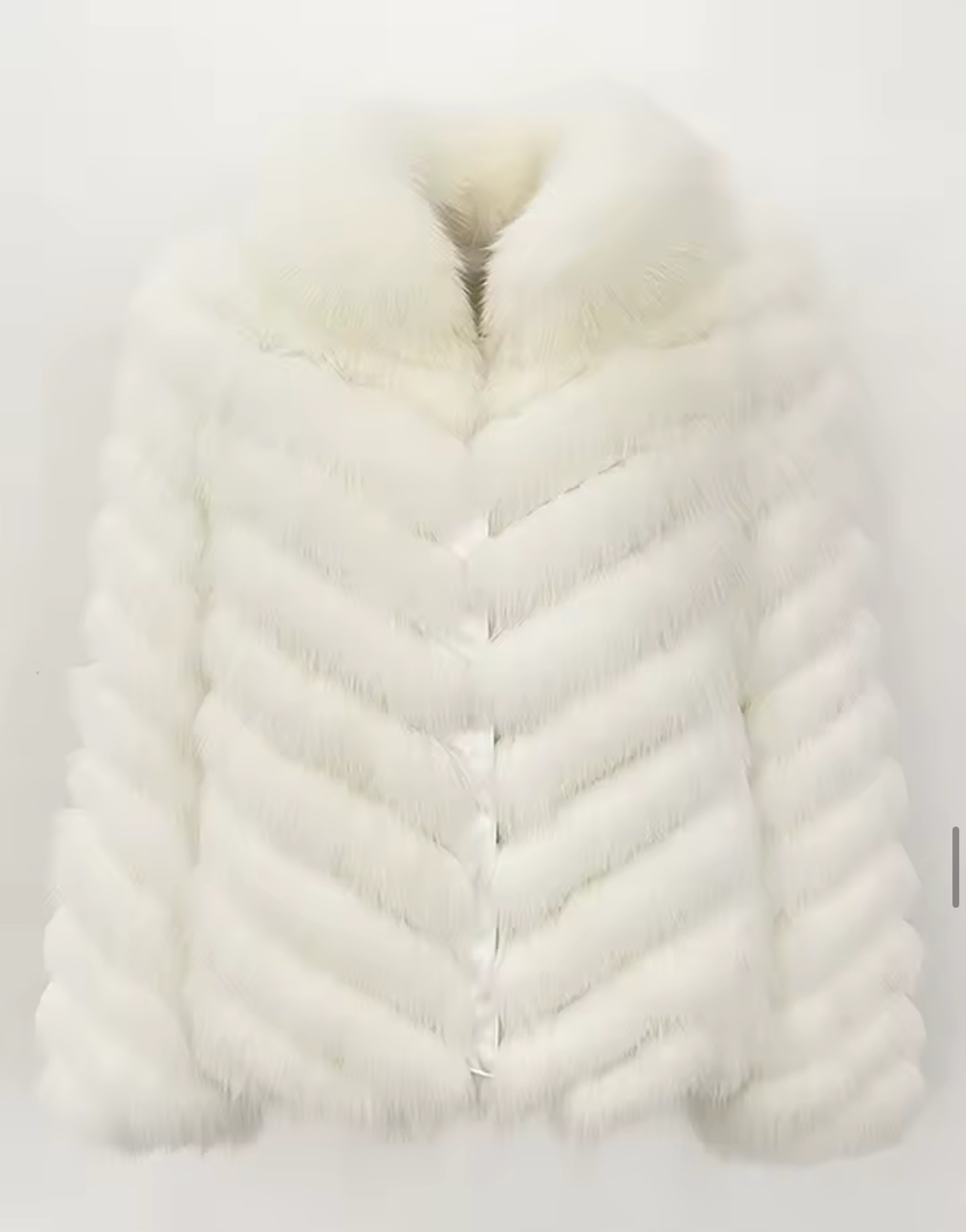 Casaco todo em pele natural de raposa, na cor branca. Ele é reversível, tem a possibilidade de usar nos dois lados. O lado interno o tecido é cetim, na mesma cor da pele.