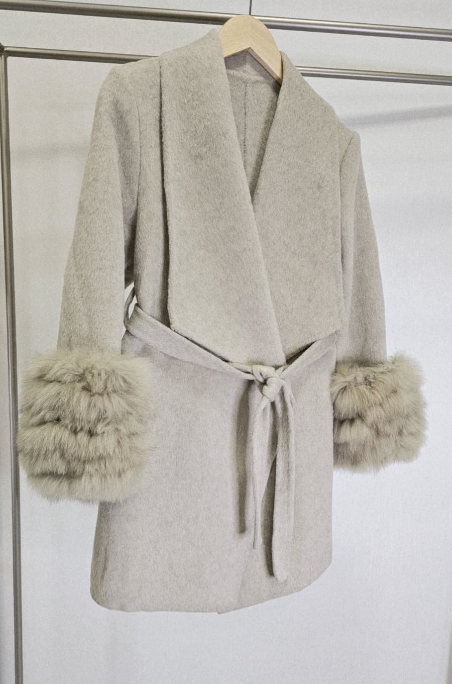 Casaco 100% la e pele natural nos punhos. Punhos largos removíveis.