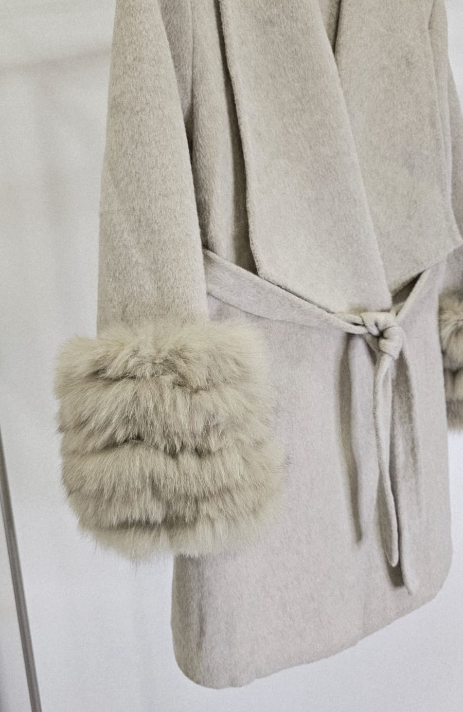 Casaco clássico e elegante, com faixa para regulagem na cintura.