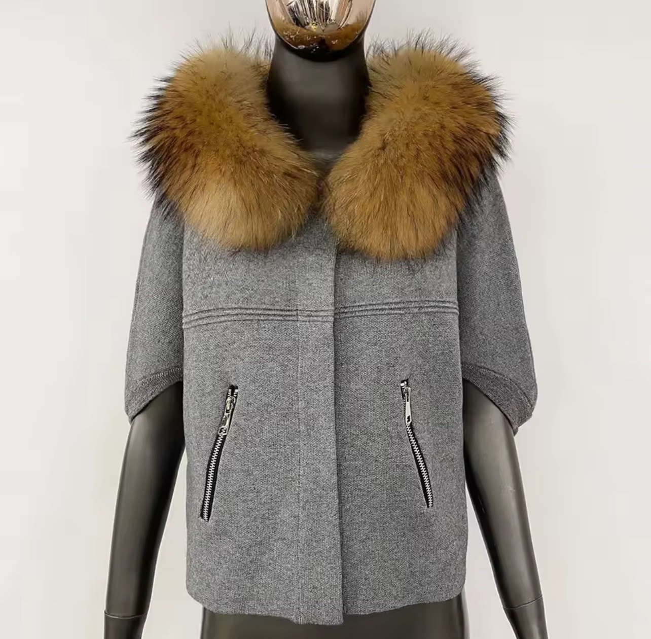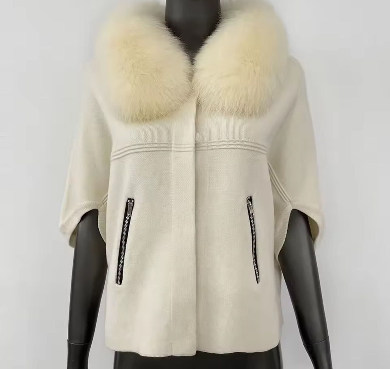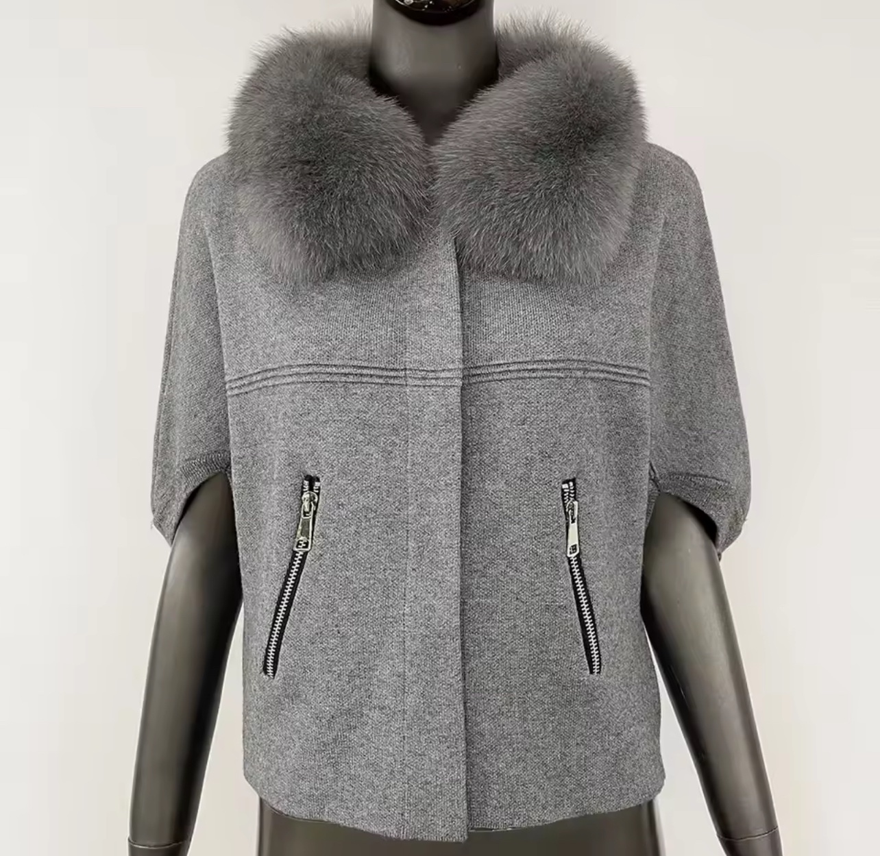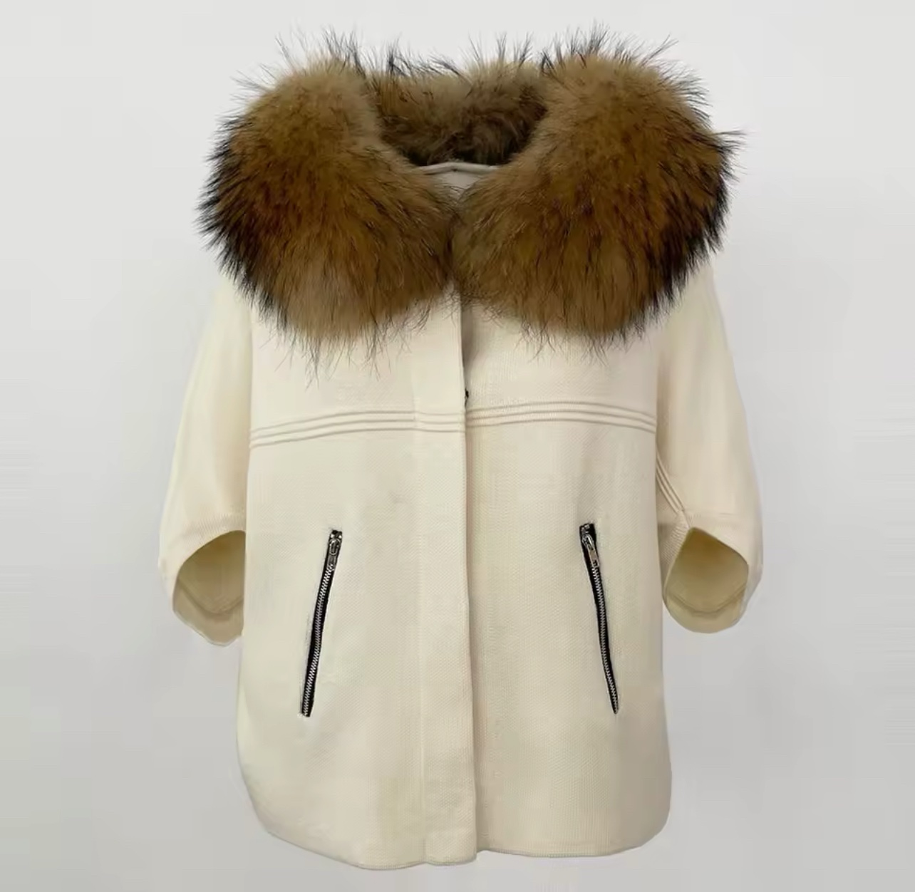 Casaqueto em cashmere com detalhe em pele na gola (removível). Bolsos frontais com zíper.