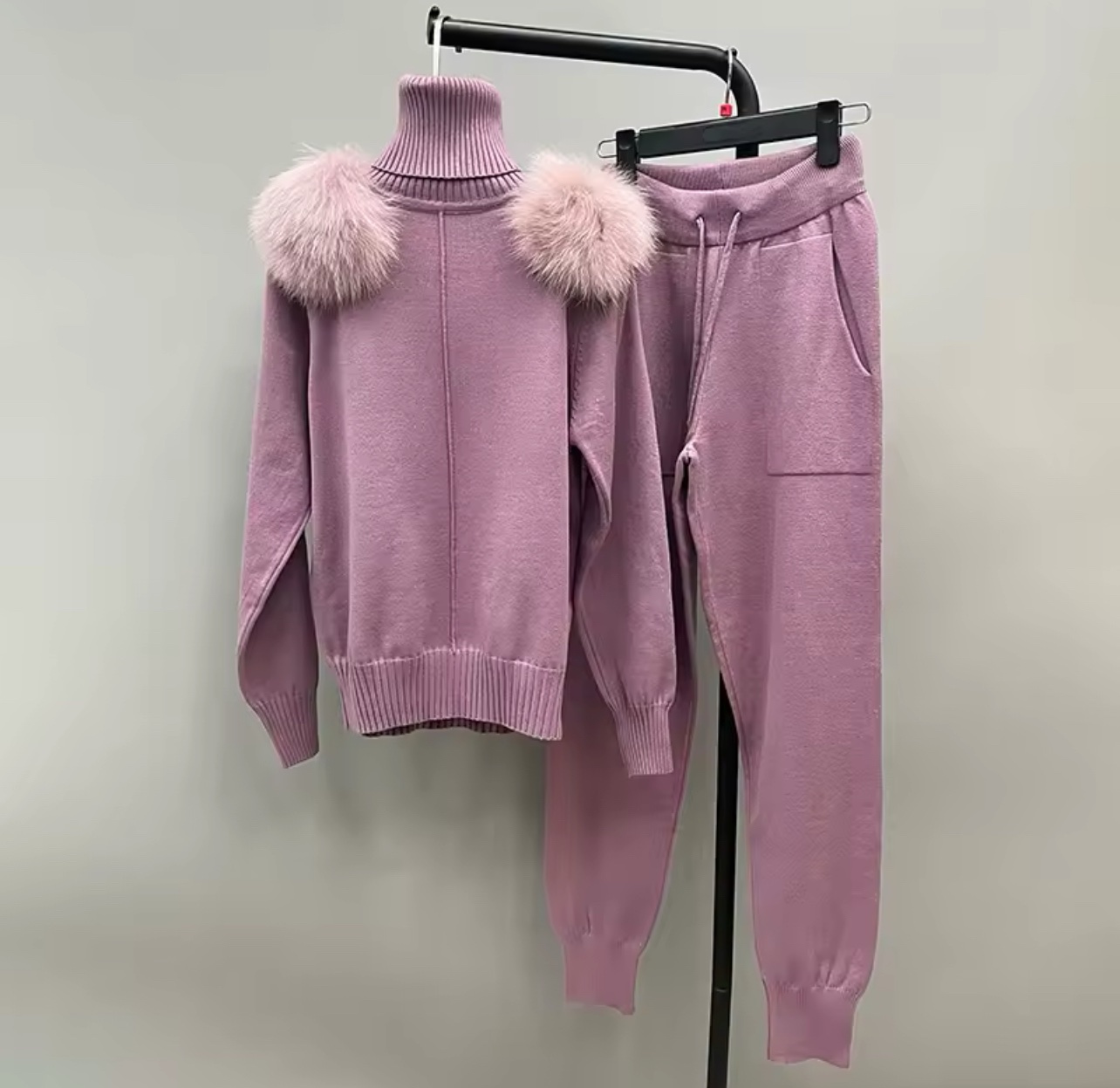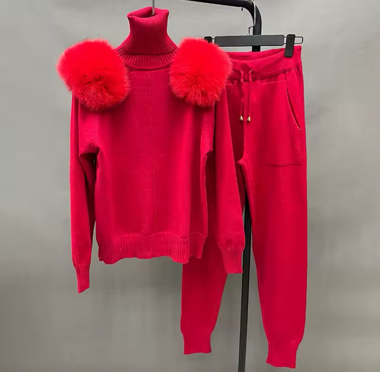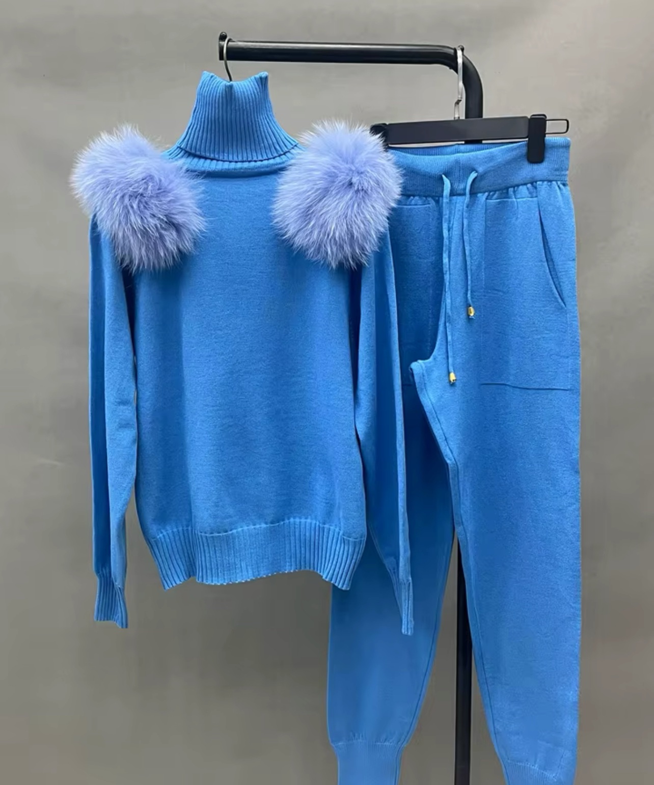 Conjunto em cashmere, com detalhe em pele nos ombros e gola alta. Calça com cintura alta, punhos nos tornozelos e bolsos frontais.