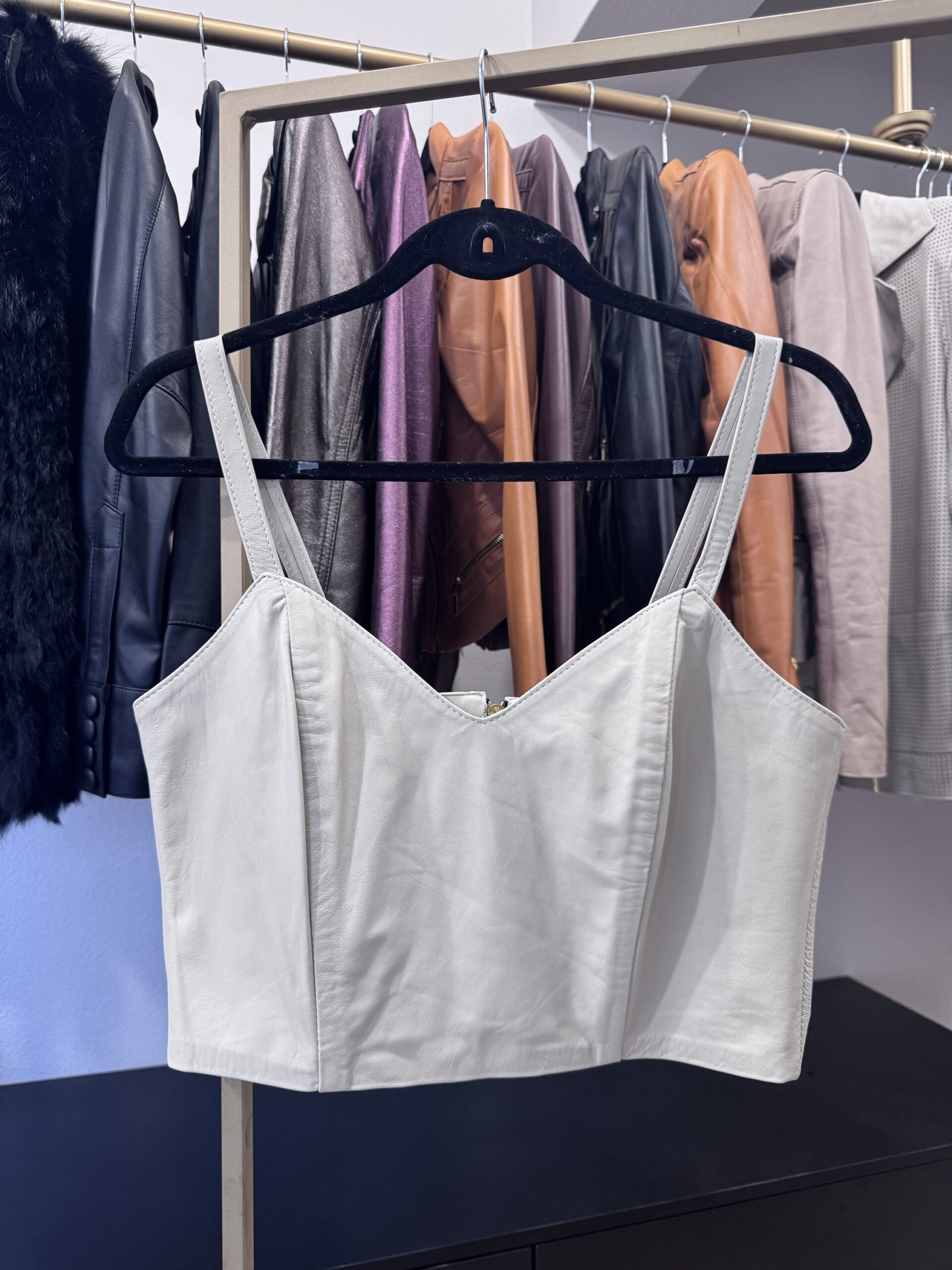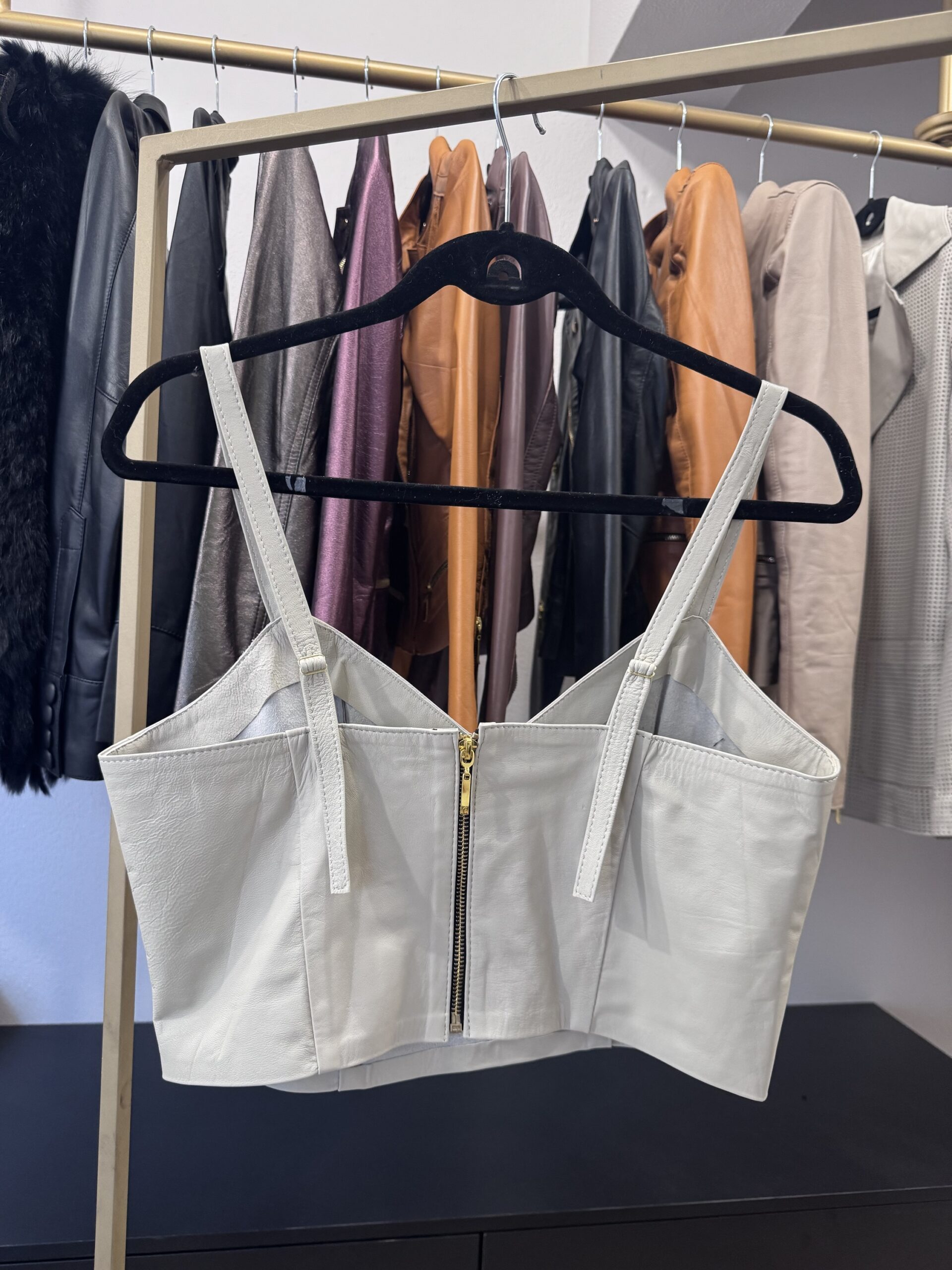 Cropped em couro pelica, Modelo Alcinha, com alças reguláveis, metais dourados, cor Off, o comprimento dele não é curto. Tamanho M e G, um de cada.