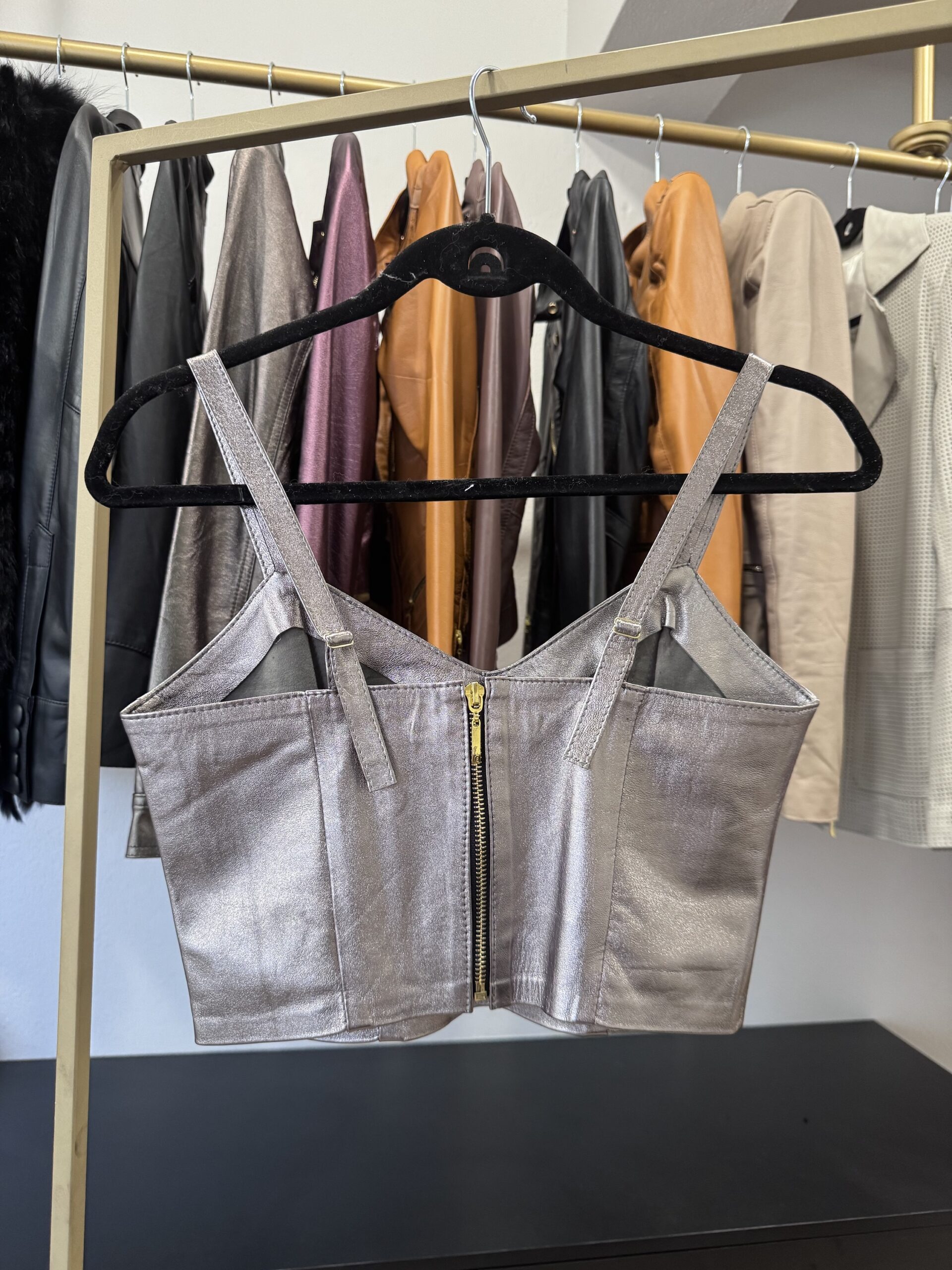 Cropped em couro pelica, Modelo Alcinha, com alças reguláveis, metais dourados, cor Prata Envelhecido, o comprimento dele não é curto. Tamanho P.