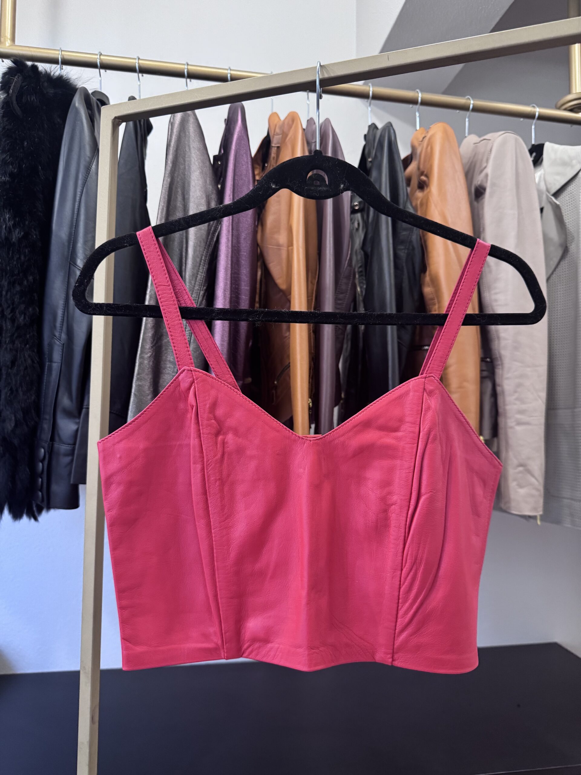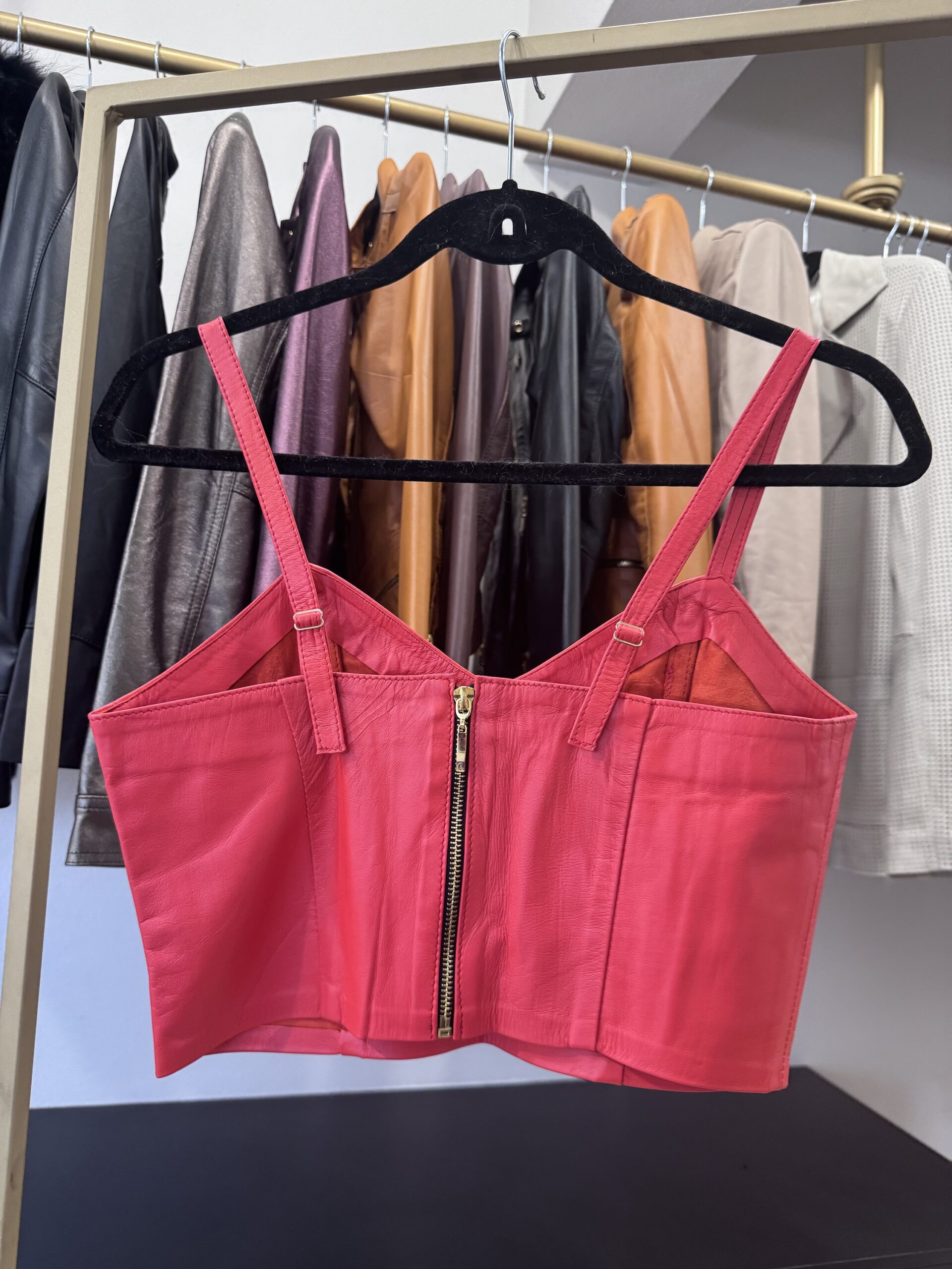 Cropped em couro pelica, Modelo Alcinha, com alças reguláveis, metais dourados, cor Vermelho Ferrari, o comprimento dele não é curto. Tamanho P.