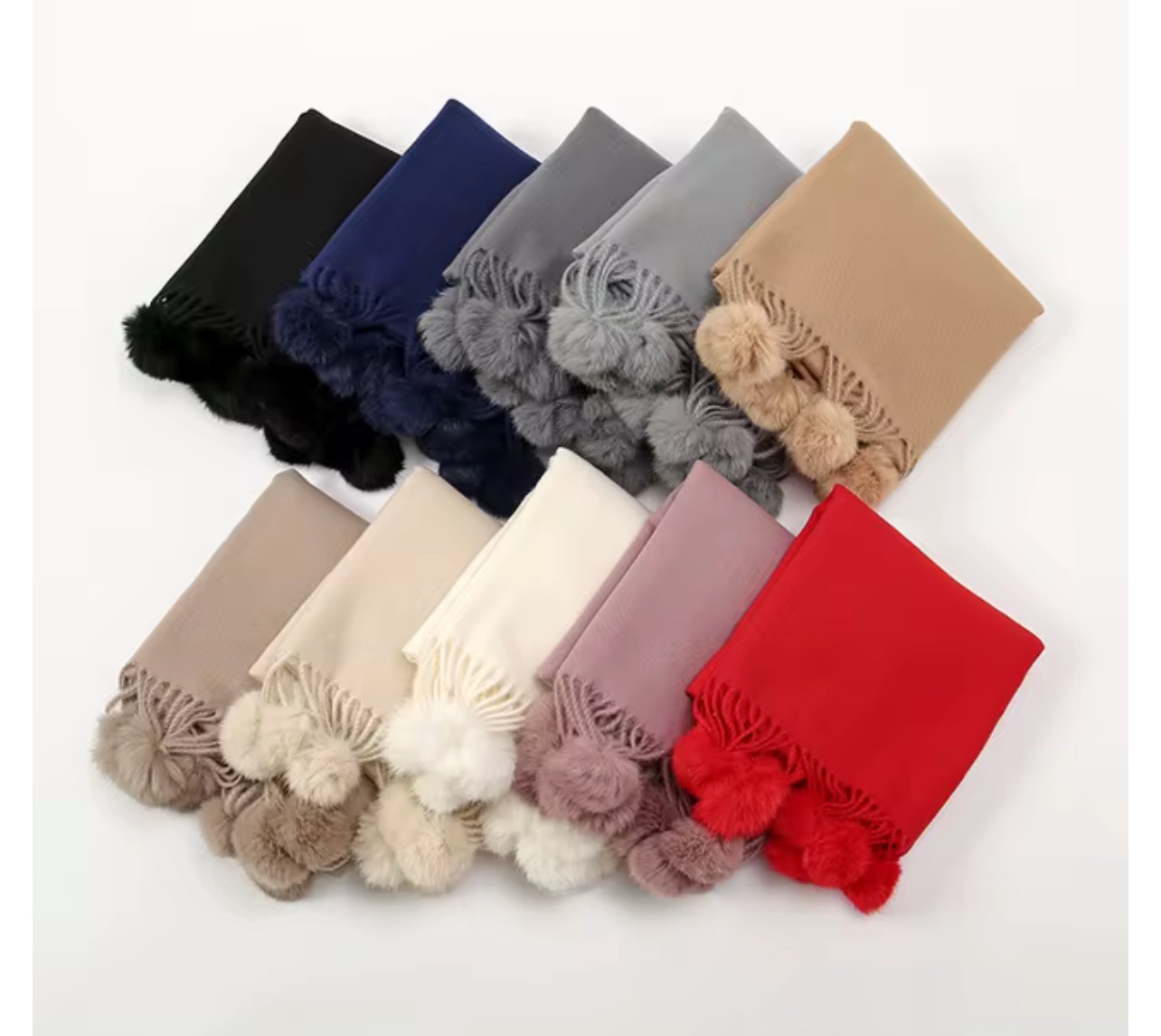 Pashmina em cashmere com detalhes em pompons em pele natural. Disponível em cores.