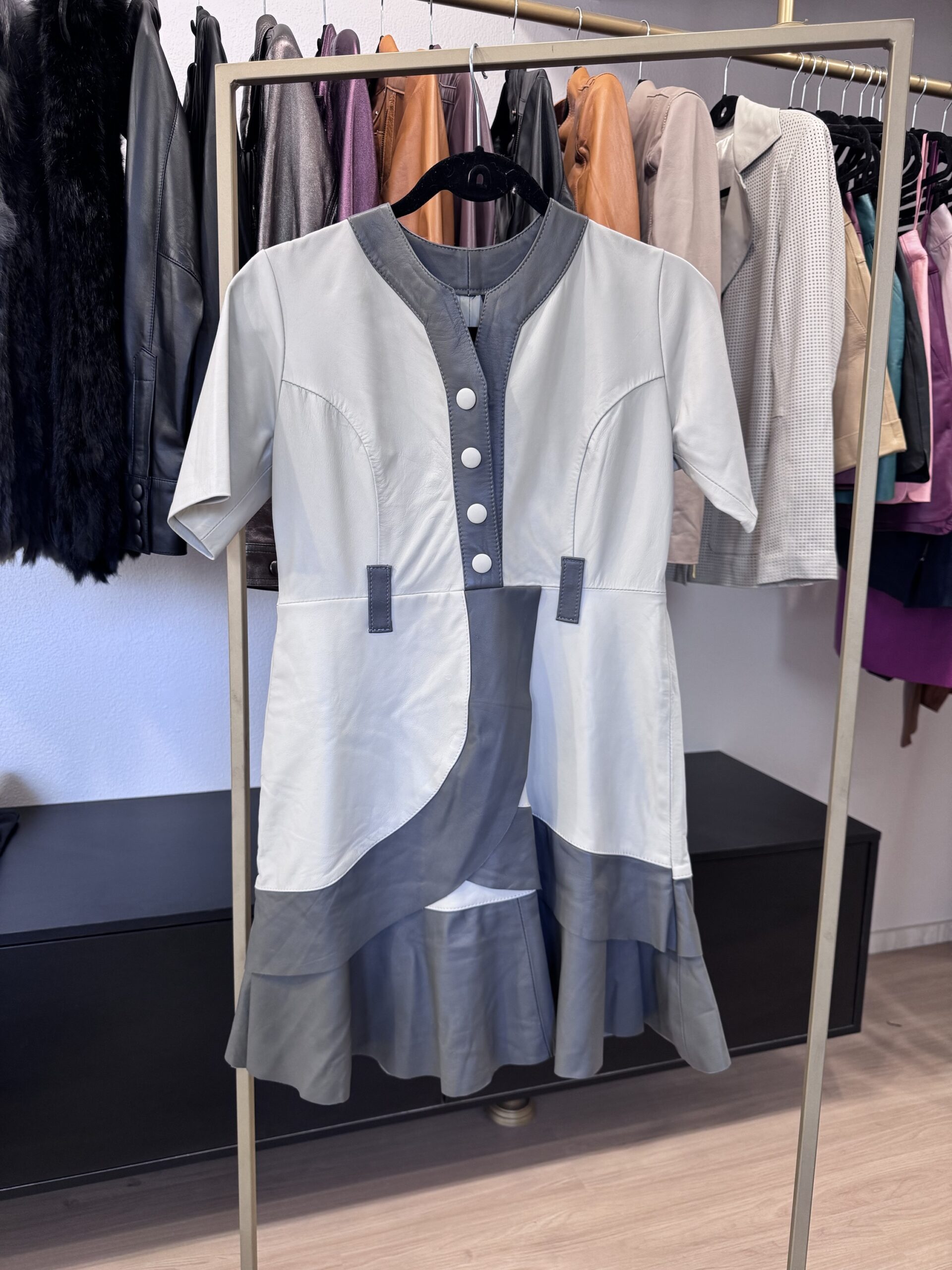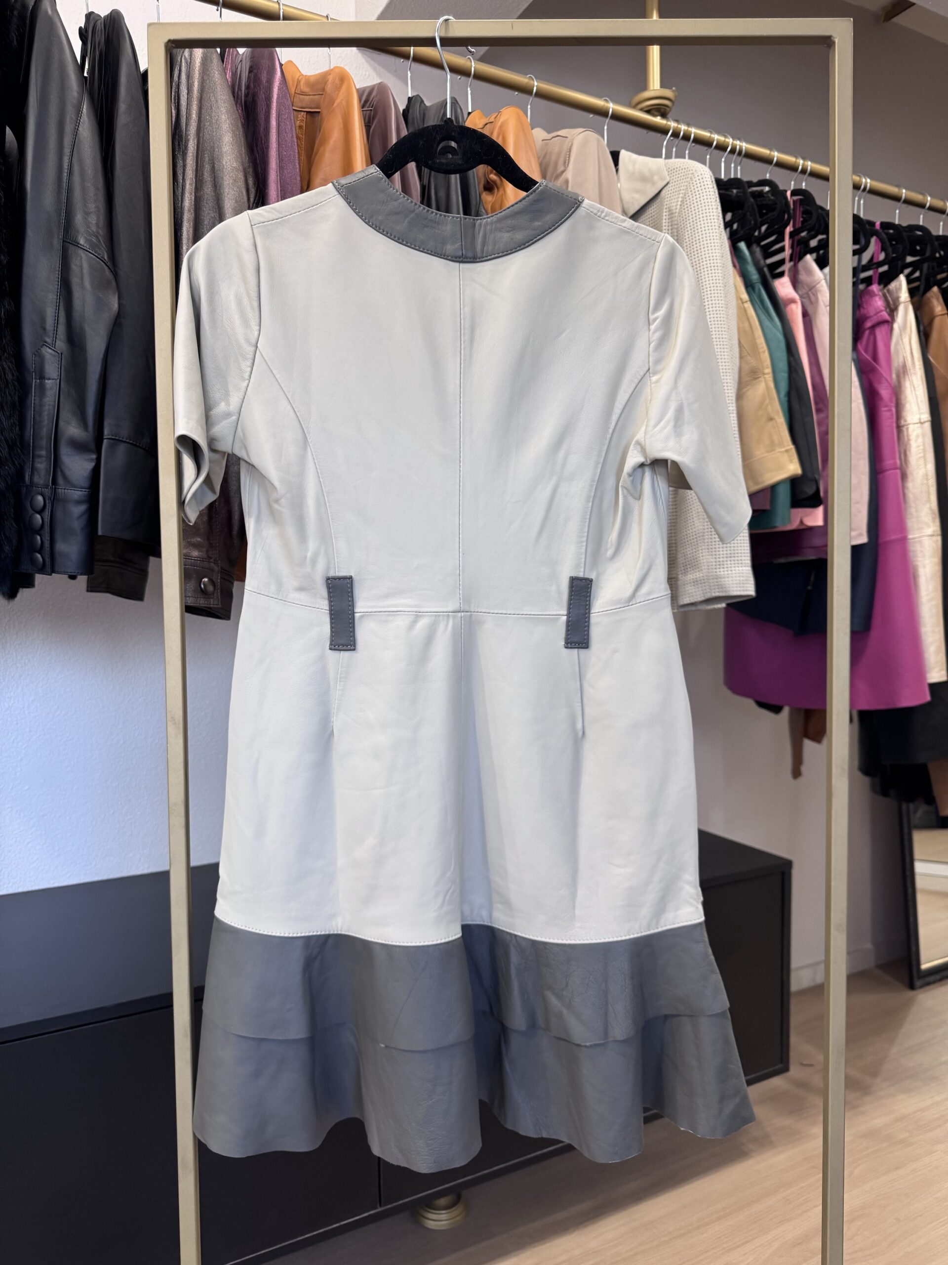 Vestido curto em couro pelica, manga curta, com detalhes na cor cinza. Tamanho 36.