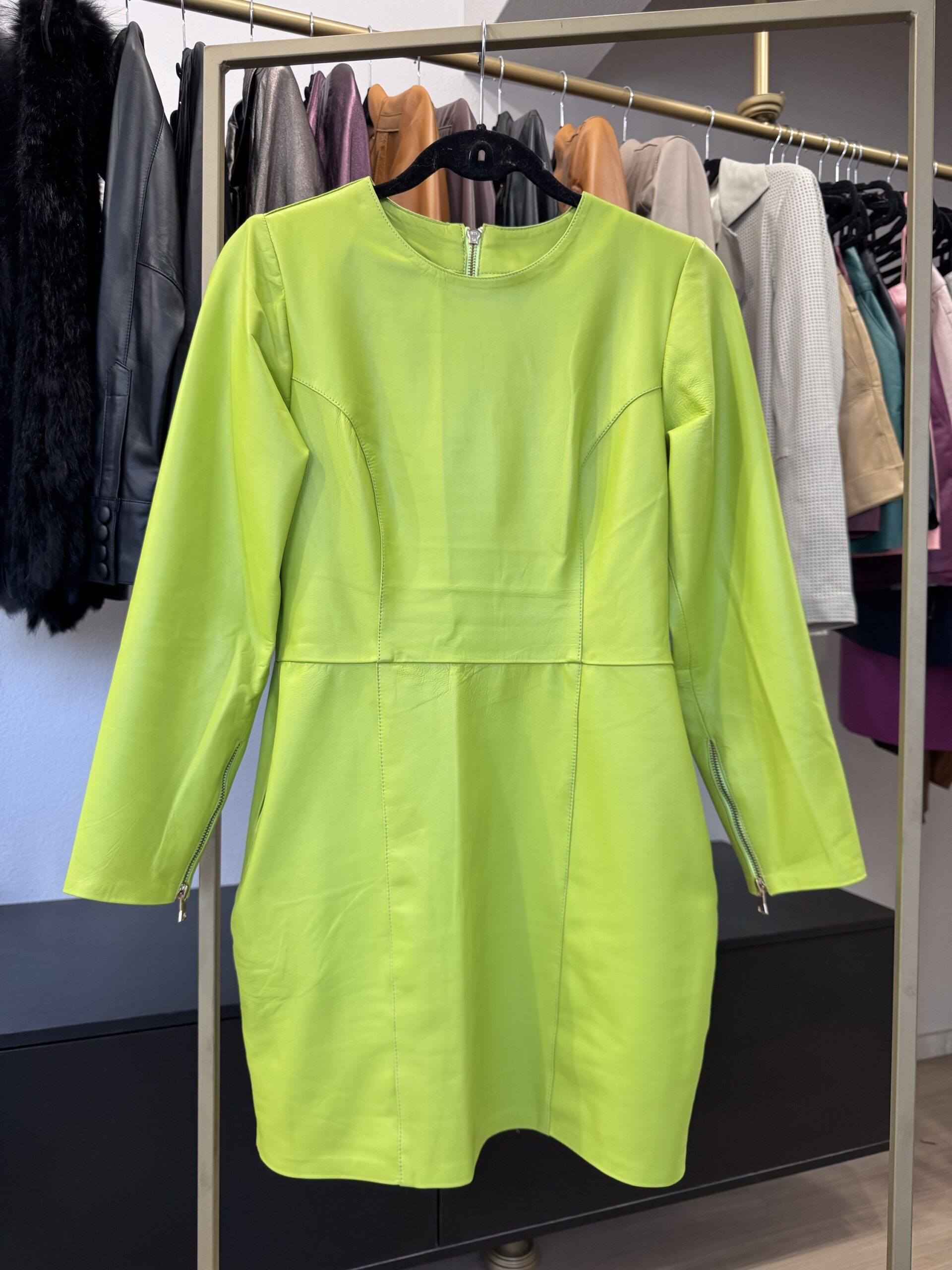 Vestido curto em couro pelica, manga longa, na cor verde lima. Com detalhes em metais dourados e bolso faca.Tamanho P.